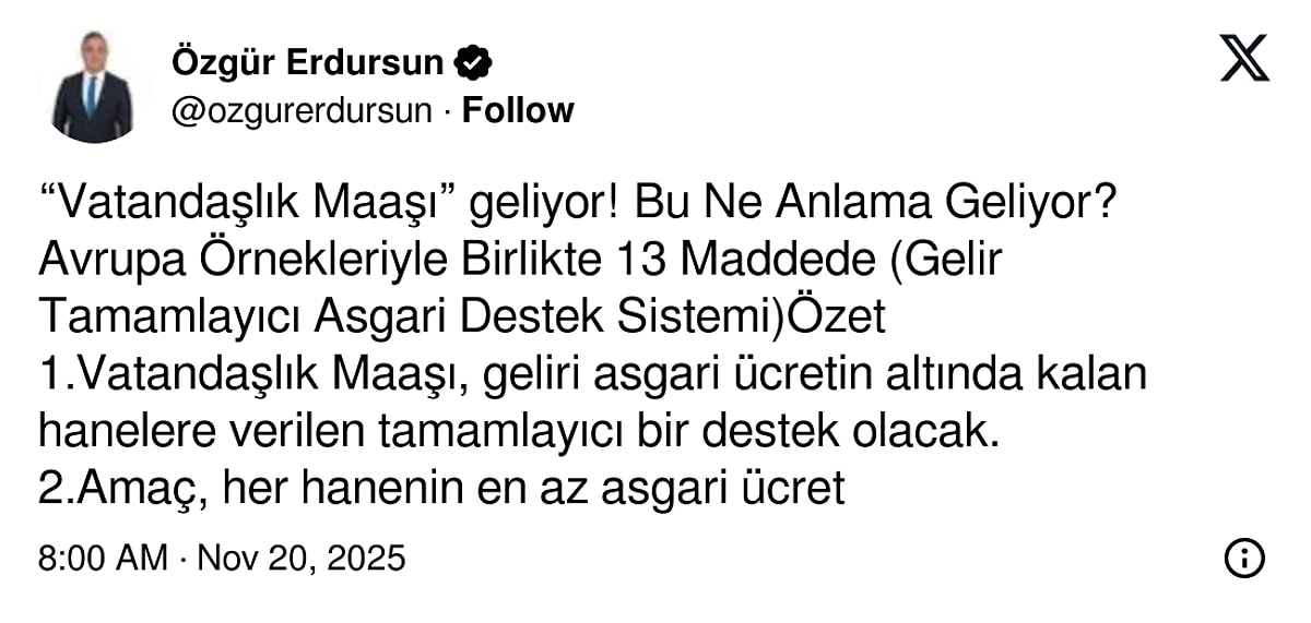 Geliri asgari ücretin altında kalan hanelere düzenli devlet desteği sağlanması, uzun süredir hükümetin masasında olan konulardan biriydi. 2026 yılıyla birlikte bu modelin hayata geçirilmesi bekleniyor. “Vatandaşlık Maaşı” olarak bilinen bu sistem, her haneye en az bir asgari ücret düzeyinde gelir ulaştırmayı amaçlayan kapsamlı bir sosyal yardım reformu olacak. SGK Uzmanı Özgür Erdursun, merak edilen bu yeni modeli 13 maddede anlatarak kamuoyunun dikkatini çekti.